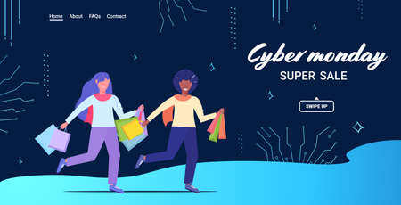 couple running with shopping bags cyber monday big sale concept christmas new year holidays discount mix race man woman shoppers with purchases full length horizontal vector illustration