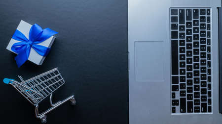 Web shopping. Laptop computer, shopping trolley and white gift with blue ribbon on dark background. Ecommerce and customer experience concept. Internet purchase, online shop