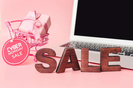 cardboard sign with the inscription cyber Monday next to the laptop. High quality photo