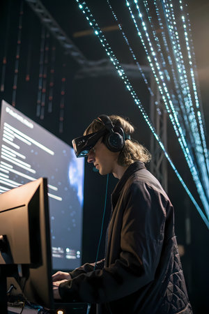 This AI-generated image features a young man wearing a virtual reality (VR) headset and headphones, deeply engrossed in a digital experience. He is seen in profile, positioned in front of a laptop, seemingly interacting with a virtual world. The background is composed of abstract, vertical lines and patterns of blue and white lights, creating a modern, technological, and futuristic atmosphere. To the left, a blurred screen displays lines of code or technical text, further emphasizing the digital and programming context. This conceptual image represents themes of virtual reality, immersive technology, gaming, digital interaction, artificial intelligence, and the metaverse