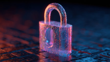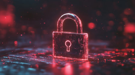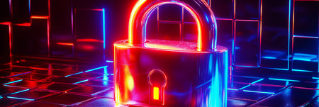 Digital padlock glowing on a circuit board, vibrant red and blue lights, secure technology