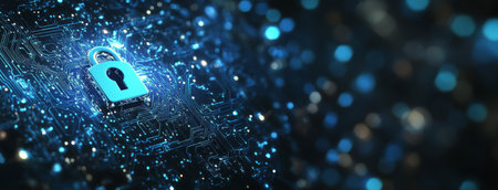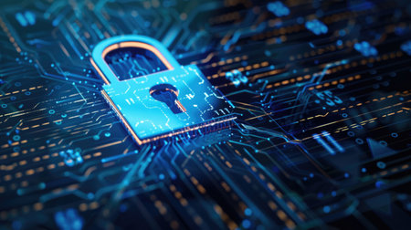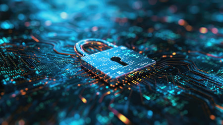 This image showcases a detailed view of a digital circuit board featuring a glowing lock symbol, representing the essential concept of cybersecurity and data protection in technology.