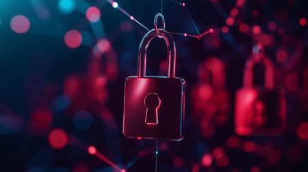 An illuminated lock, the central subject, is shown against a dark backdrop with numerous interconnected lines and glowing dots. The image features a digital, network-like composition. Suitable for visual concepts around protection, safety, and modern technological solutions. Potential uses include editorial and commercial projects focusing on digital security.