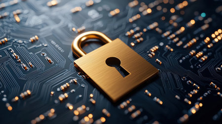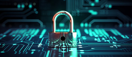 Padlock symbolizing cybersecurity, data protection, and privacy on a circuit board