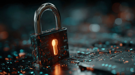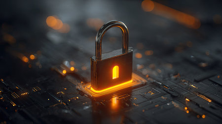 A close-up view presents a metallic padlock, illuminated with orange light, positioned on a circuit board. The image displays a dark, blurred background and highlights textures. The composition employs overhead lighting to create a sense of depth, suitable for representing protection and safety. This visual is applicable for various commercial and illustrative purposes.