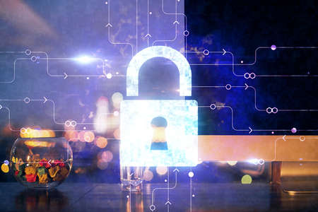 Double exposure of desktop with computer and lock icon hologram. Concept of data safety.