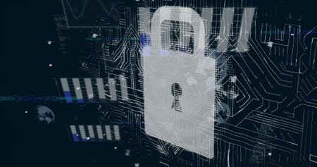 Circuit board padlock on cyber background, depicting digital data security