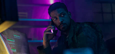 Hacker in military unifrorm on dark web, cyberwar concept.