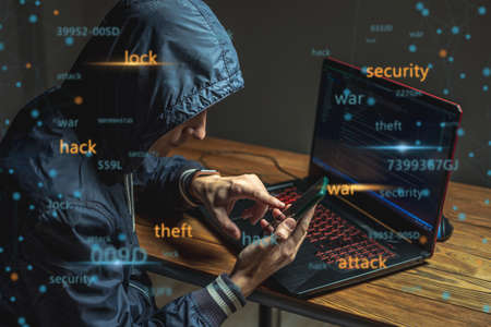 Dangerous hooded hacker on laptop breaks internet code and spread virus on a computer systems