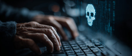 Close-up of hands on a keyboard with a glowing skull on screen, representing cybercrime, hacking, and digital security threats.