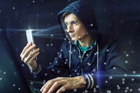 The hacker is trying to hack into the phone using the personal identification method of face recognition according to the polygonal mesh. The concept of modern technology