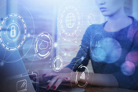 Attractive businesswoman in formal dress using laptop, work in office on new project. Double exposure. Concept of success. Lock security and social media icons.