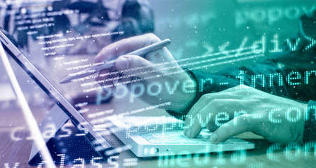 Writing programming functions on laptop. Big data and Internet of things trend. software development. Internet security hack