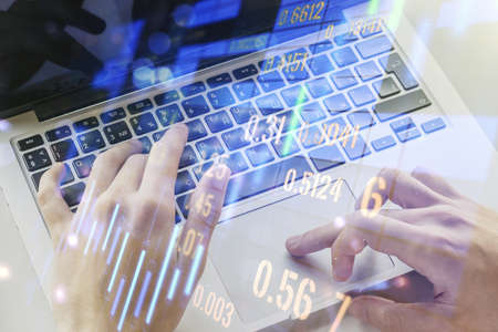 Double exposure of abstract creative financial diagram with hand typing on computer keyboard on background, banking and accounting concept