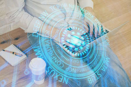 Multi exposure of data internet theme hologram with man working on computer on background. Concept of innovation.