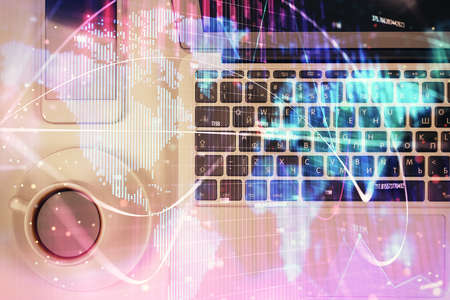 Business theme hologram drawings over computer on the desktop background. Top view. Multi exposure. Concept of international connections.
