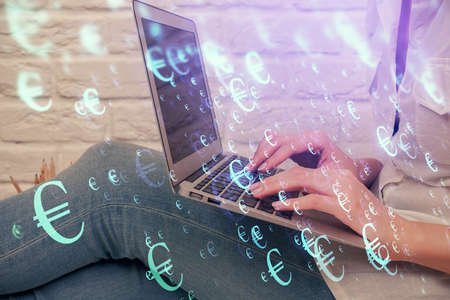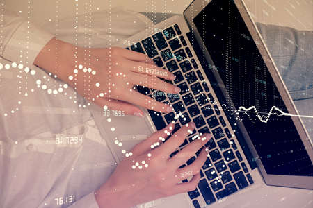 Multi exposure of woman hands typing on computer and forex chart hologram drawing. Stock market analysis concept.