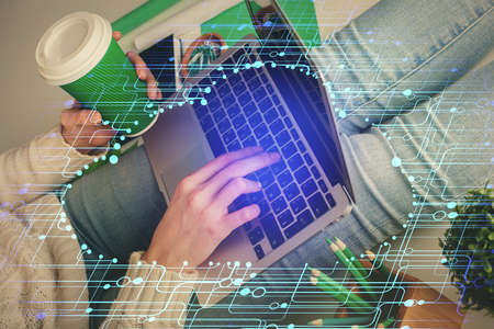 Double exposure of woman hands working on computer and data theme hologram drawing. Top View. Technology concept.