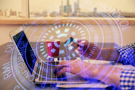 Double exposure of data internet theme hologram with man working on computer on background. Concept of innovation.