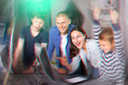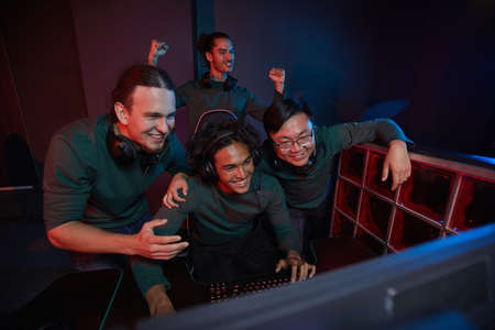 Group of excited gamers happy their victory in computer game they looking at computer monitor and smiling during their playing