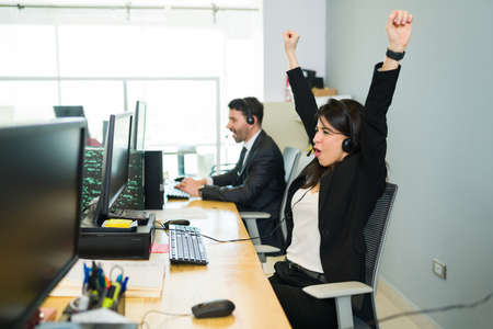 Thrilled young woman raising her arms and shouting with happiness while sitting at her desk in a call center. Sales representative winning a big sale deal