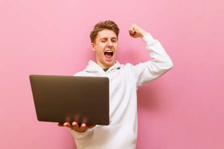Joyful freelancer with a laptop in his hands on a pink background, rejoices with his arm raised up, looks into the camera and smiles. Happy guy with laptop isolated on pink background. Copy space