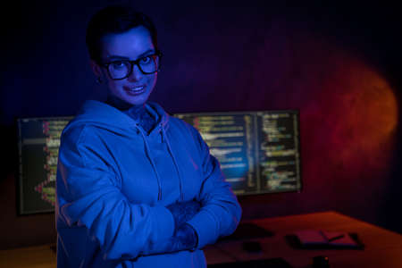 Photo of confident smart programmer wear hoodie piercing glasses arms folded indoors workstation workshop