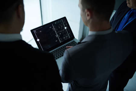 Closeup of laptop running algorithm parsing code on desk in front of programmers doing team work on group project. Portable computer compiling database in software developing office.