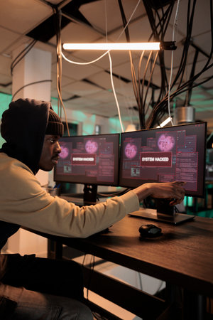 African american spy looking at hacking alert on multiple screens, planning security breach to steal personal information or passwords. Young adult using trojan virus and computer malware.