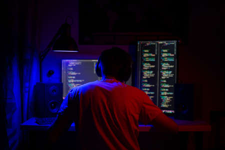 Rear view of computer hacker sitting and reading a computer code reflecting on his back