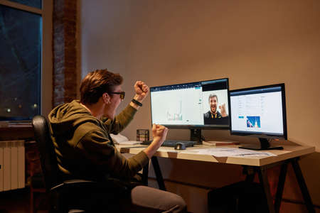 Joyful man celebrate with colleague at video call