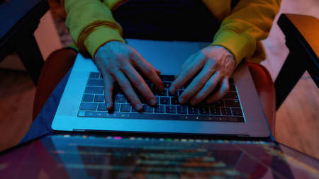 Hands of contemporary programmer pressing keys of laptop keyboard while sitting by desk and working with decoded data