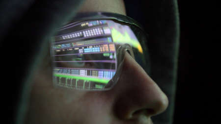 Hooded Hacker in Futuristic Glasses Looking at Computer Screen Code in Dark