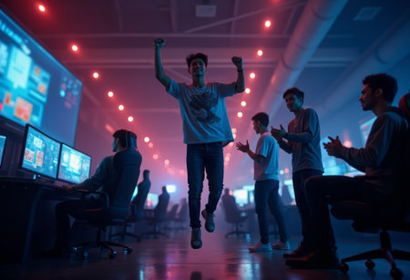A group of friends celebrates with excitement at a gaming tournament, with colorful lights and screens creating an energetic atmosphere. The scene captures the joy and intensity of the competition.