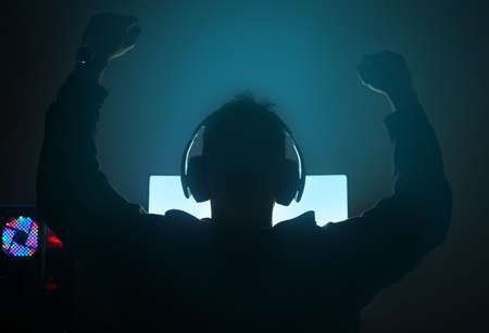 Back view of exited cyber sportsman rejoices he won the battle