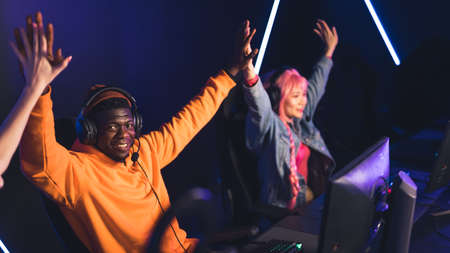 Team of young adults gamers playing in a multiplayer video game on pc in a gaming club. Success, competition, leisure time. High quality photo