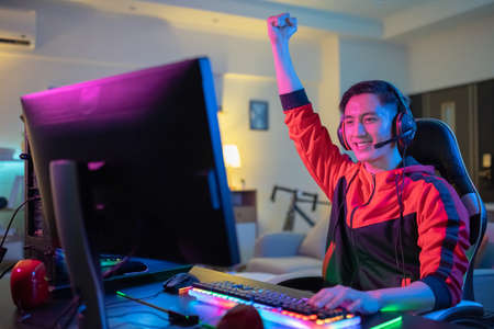 Happy young asian gamer with headset playing and winning the computer game tournament.