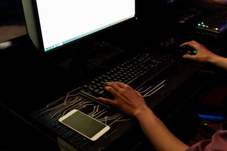 Hand of gamer typing on gamer keyboard. Black screen smartphone on the table. White screen on monitor.