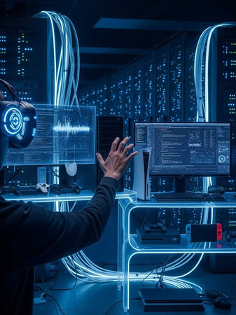 Person reaching towards holographic screens in a futuristic tech environment