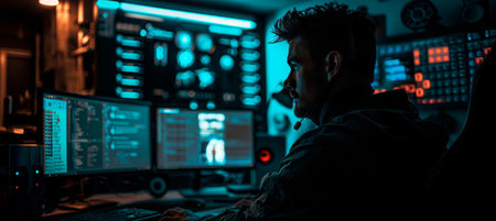 Dark working place of a programmer or hacker with computer