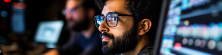 Focused Software Developer Analyzing Code on Computer Monitors Late at Night in the Office