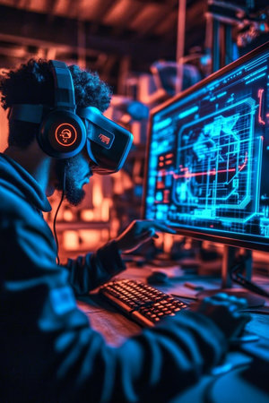 Hacker installing spyware using neural networks tech to secretly gather data about user activity. Rogue software developer coding exploits using AI technology to gain unauthorized access