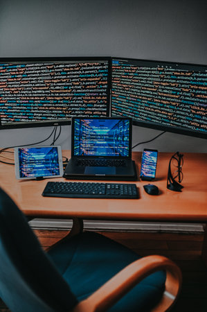 A vertical shot of programmer's desk with types of electronic equipment displaying codes
