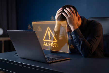 A desperate man sits in a dark office clutching his head while a glowing orange holographic warning sign labeled alert floats above his laptop screen indicating a critical cybersecurity failure.