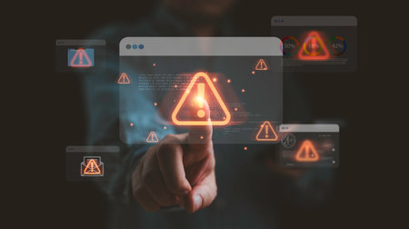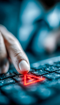A finger presses a red warning symbol on a sleek digital keyboard, emphasizing online security alerts and the importance of threat monitoring in cyber