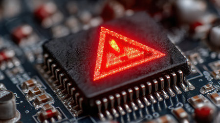 A red warning symbol glows on a microchip surface, indicating a possible issue with the electronic devices operation and performance.