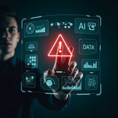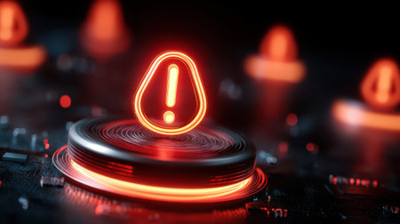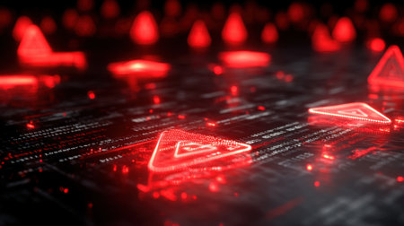A captivating image featuring red glowing warning symbols set against an abstract digital background, highlighting a futuristic technology theme.