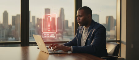 Serious man typing on a laptop, facing a digital critical error warning alert pop up, indicating a technical issue or system failure in a modern office overlooking a city skyline