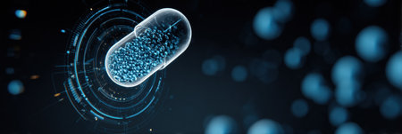 A holographic display presents a three-dimensional rotating capsule, revealing intricate details of its interior, illustrating advanced medical technology.