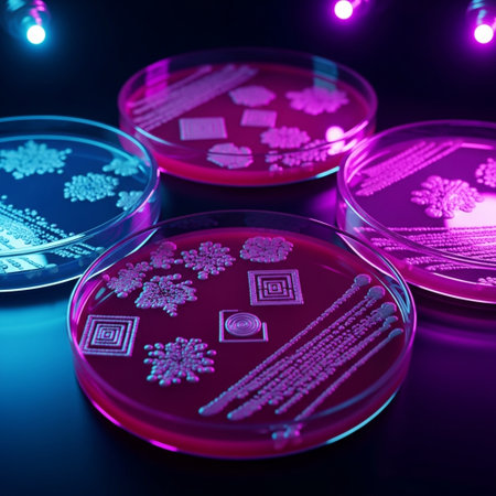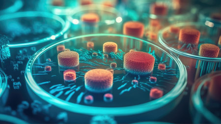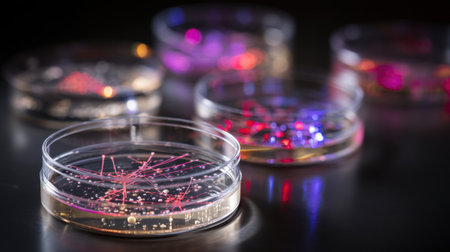 Vibrant and colorful petri dishes filled with various cultures demonstrate scientific research in a modern laboratory setting. Each dish reveals microbial growth.